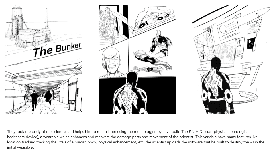 This journey is visualized through the storyline, as it portrays how the wearable revived the scientist, enhanced his capabilities, and equipped him with the power to strike back against AI supremacy.
