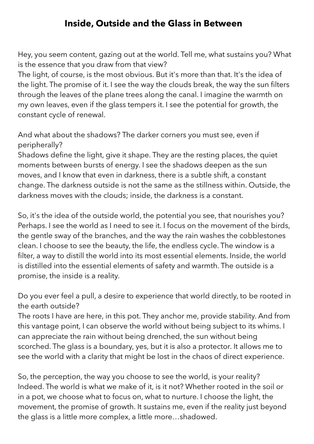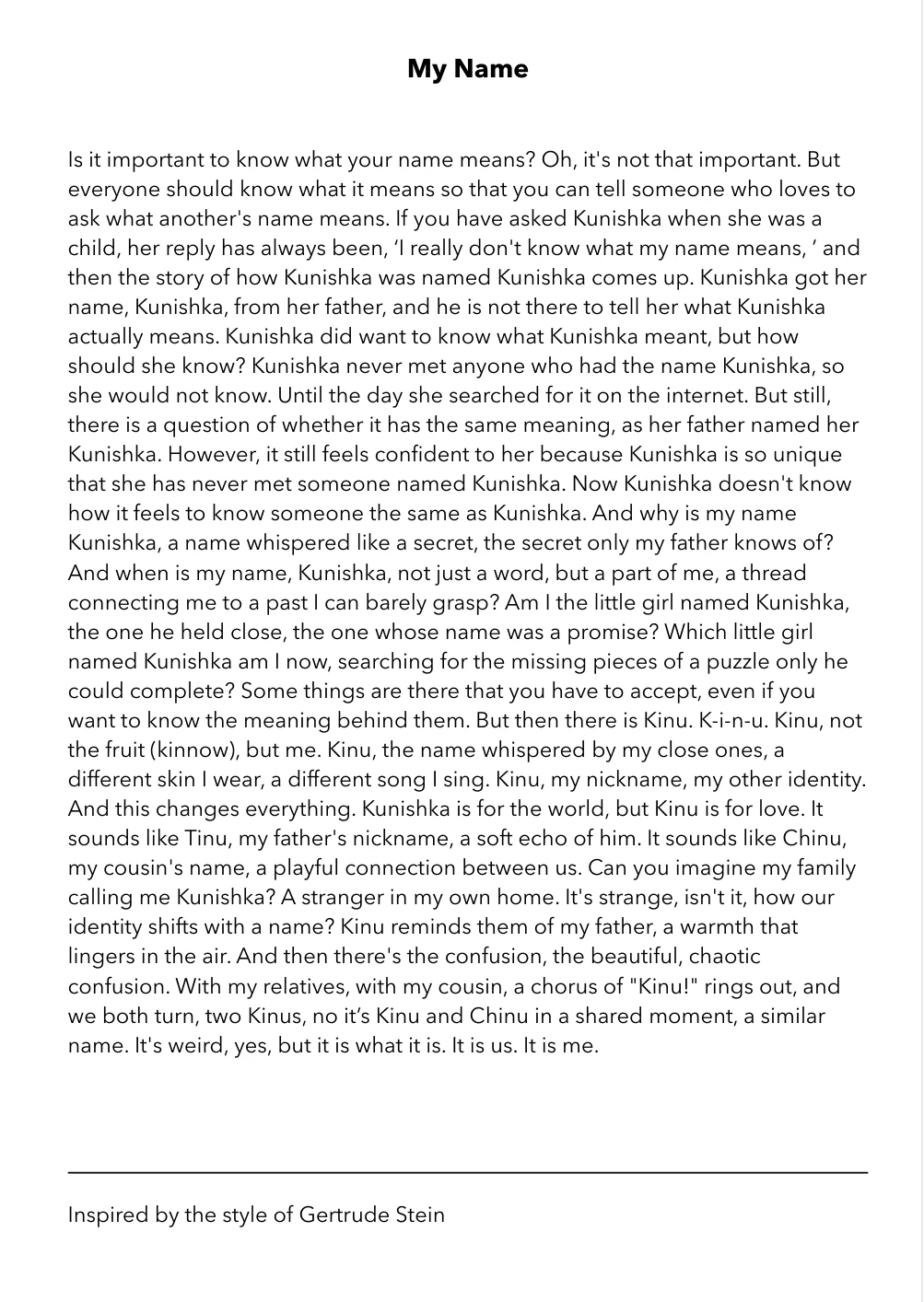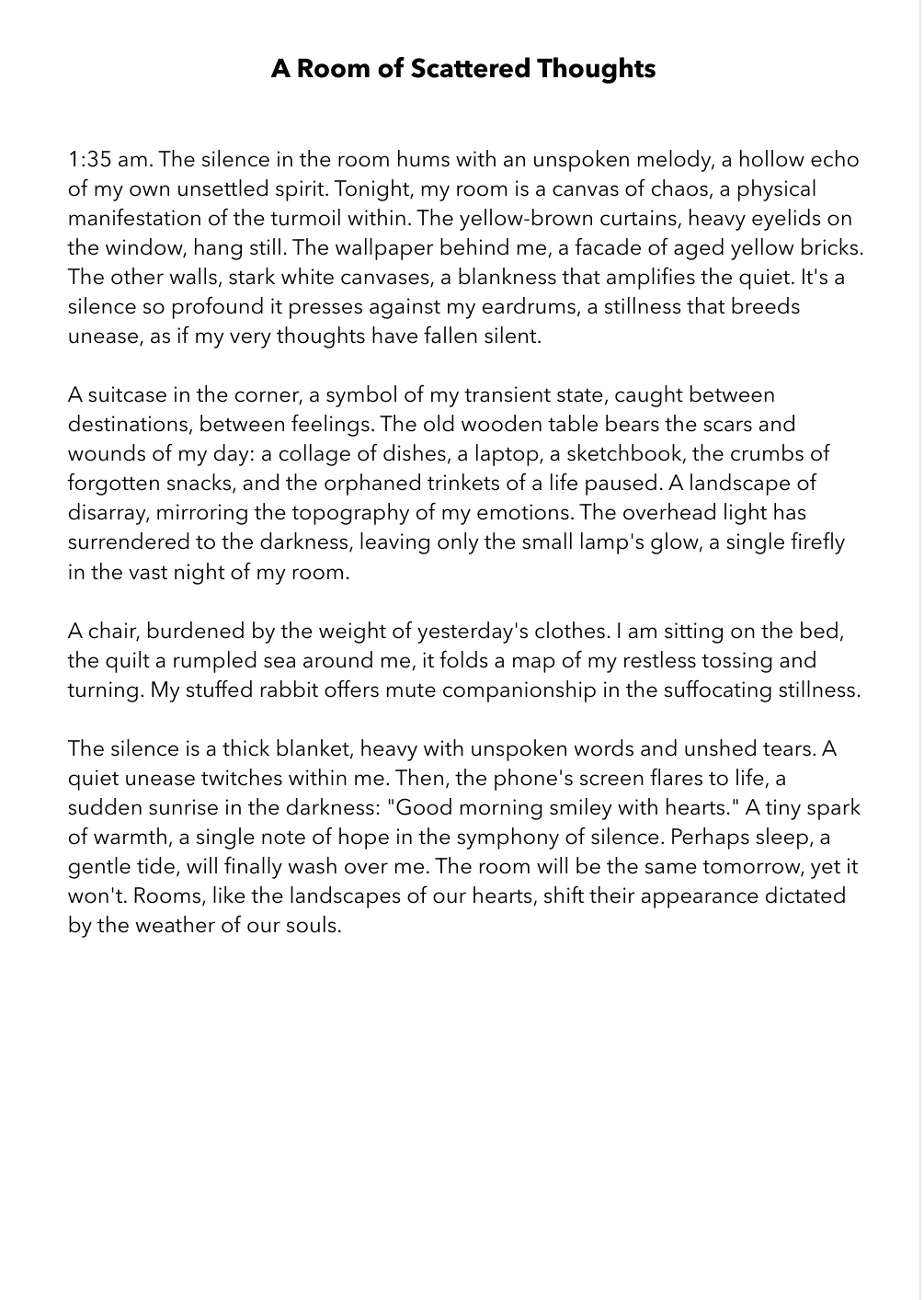 Each piece, whether a story, a reflection, or a letter, offers a glimpse into my journey as a writer and as a person navigating the complexities of identity, memory, and growth. My hope is that these pages resonate not only with those who know my journey but also with anyone who has ever questioned, dreamed, or searched for meaning within themselves and the world around them.